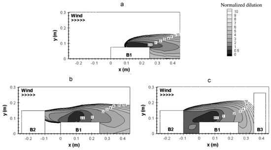 Normalised pollutant concentration from study [] (Reprinted with permission from []), showing the change in the dispersion of pollutants with the addition of buildings: (a) isolated building case; (b) additional building upstream of pollutant source; (c) a third building downstream of the pollutant source.