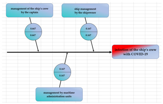 The analysis of the relative values of the main causes showed that the greatest significance of that group of causes affecting COVID-19 infections among sea crews is the management of the ship’s crew by its captain (the relative value was 0.667). In the case of the other two main causes, i.e., management by the shipowner and management by maritime administration units, their importance is much smaller. In both cases, it is 0.167 each (Table 1, Figure 2).