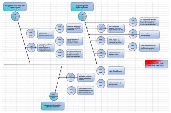 Returning to the main threat, the study, which resulted in the development of a weighted Ishikawa diagram determinant of infections of crew members on sea-going ships, focused on the search for an answer to the fundamental question: What causes, despite the management of the safety, operation, and crew of the ship at sea, any infection of their crews with the COVID-19 virus occurs at all? This is important because there are many provisions of international law or guidelines and recommendations formulated by the international maritime organizations and port procedures that are supposed to prevent them. In addition, there are many internal ship management procedures developed by the ship owner and/or operator, often in cooperation with powerful insurance institutions or banks (which, incidentally, can also act as ship owners), estimating the risks and their costs that may be associated with it.