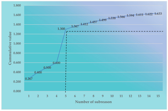 The report field in Figure 4 is an indicator of the division and is formed by the area of the rectangle determined by a given point of the Lorenz-Pareto curve. The size of the reference field is calculated by multiplying the cumulative value by N (N = 15 − n), where 15 is the number of all subcauses and n is the sequence number of the subcause. It reached its maximum for subcause No. 5 (preparing defective legal regulations concerning the seafarer’s working time) and amounted to 13.000.