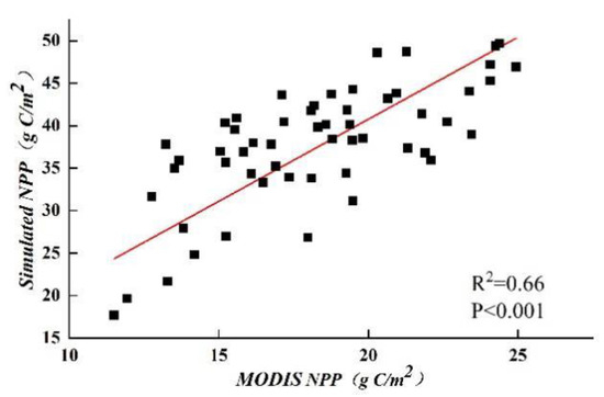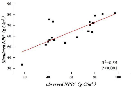 Spatial comparison of observed data with the data generated by the CASA model provided a means of evaluating accuracy. Figure 2 shows the results of the correlation analysis of observed and simulated NPP, for which R2 = 0.55 (p < 0.01). The observed NPP data apparently agree with the modeled data.