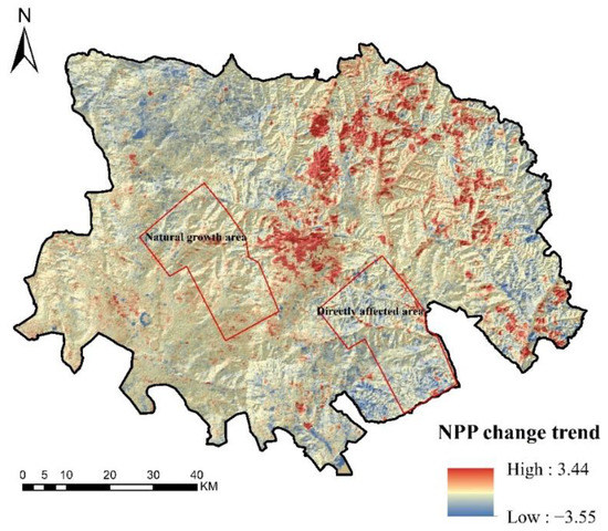 - The change trend for vegetation NPP in the direct affected area and natural growth area over the years is basically consistent with the change in the overall vegetation NPP. Before 2009, the vegetation NPP in the area directly affected by coal mining was mostly smaller than that in the natural restoration area. After 2009, the vegetation NPP in the area directly affected by coal mining was mostly larger than that in the natural restoration area. This is related to the local mining situation and ecological restoration measures.