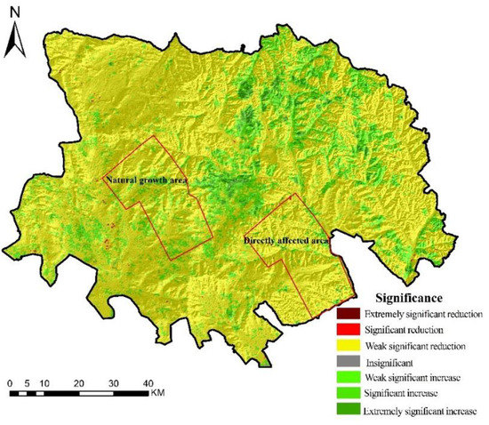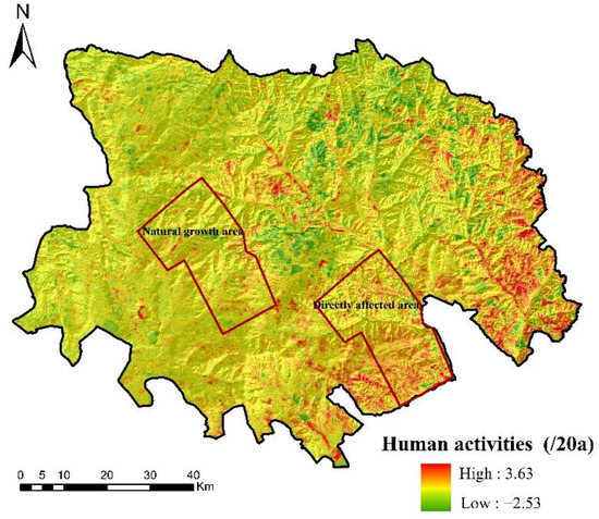 Figure 11 shows the spatial distribution of the influence of human activity. Negative values indicate the influence of human activity on NPP. Only a very limited area experienced a negligible influence of human activity on NPP. The area where human activity appeared to have enhanced NPP accounted for 90.86% of the total study area. Intuitively, coal mining areas show greater human activity influence than other areas.