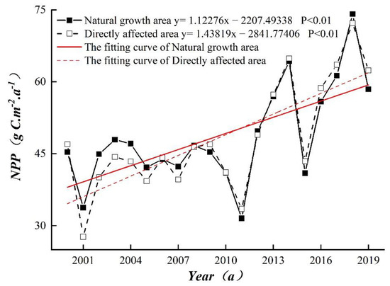 The directly affected area and the natural growth area in the past 20 years are listed one-to-one to determine the response law of the artificial vegetation and the natural growth area. Figure 8 shows the comparison and fitting curve of the annual NPP values between the direct affected area and the natural growth area. It can be seen that the overall net primary productivity of vegetation in both the directly affected area and the natural growth area shows a fluctuating upward trend, and the change is basically the same as that in the study area. Among them, the multi-year average value in the study period of the direct affected area is 48.26 g C/m−2 a−1, and its tendency rate is about 1.44/a. The multi-year average value in the study period of the natural growth area is 48.69 g C/m−2 a−1, its tendency rate is about 1.12/a, and both areas pass the p < 0.01 significance test. At the same time, it is not difficult to see that, compared with the two areas, the vegetation NPP in the area directly affected by coal mining was mostly smaller than that in the natural recovery area before 2009.