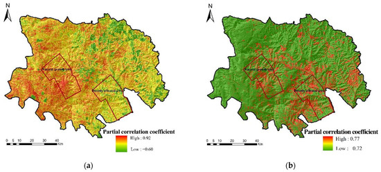 Partial correlation coefficients for annual average temperature and annual precipitation with NPP from 2000 to 2019. (a). precipitation; (b). temperature.