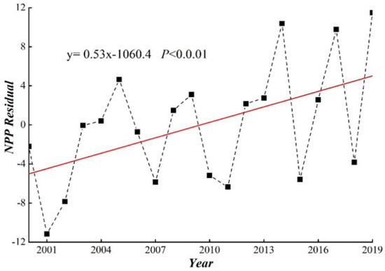 Based on the results of correlation analysis, this paper selects precipitation and temperature factors in the current year, establishes a linear regression equation based on the pixel scale to predict NPP, and obtains NPP time series with only the climate effect, so as to obtain the residual value, which is the impact of human activities on NPP. Figure 10 shows the overall trend of the estimated influence of human activity on NPP from 2000 to 2019. The trend shows a slope of 0.53 per year with considerable variation around the trend. The impact of human activity on NPP since 2011 appears relatively high in the study area. This may relate to local environmental protection efforts. The human influence on NPP from 2015 to 2018 appears relatively weak. This may relate to meteorological factors in the study area and coupling effects.