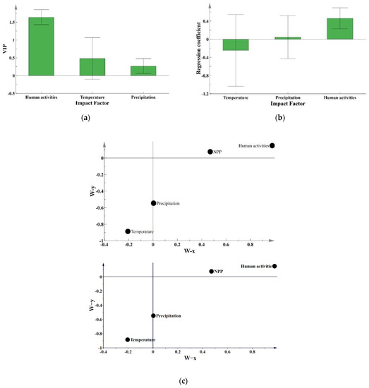 Partial least squares analysis was used to address multivariate commonality problems arising from intercorrelated variables [35]. As shown in Figure 12a, the ability of variables to explain changes in NPP (VIP) is ranked as follows: human activity (1.64) >temperature (0.48) >precipitation (0.27). This indicates that human activity explains more variation than climate variation does, especially in recent years. Temperature appears to exert a stronger influence than precipitation on vegetation NPP. Figure 12b gives regression coefficients for the estimated regression equation of . The terms x1, x2, and x3 indicate precipitation, air temperature, and human activity. As seen in Figure 12c, air temperature exerts a negative effect on NPP while other factors, including human activity, exert a strong positive effect, indicated by an increase in NPP. These relations suggest that recent interventions promoting NPP have succeeded.