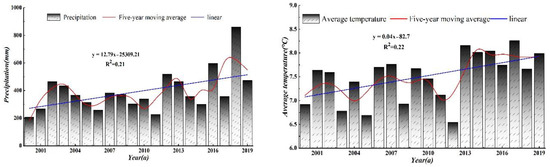 Variation trends, linear trend, and 5-year moving average of precipitation and average temperature in the study area from 2000 to 2019.