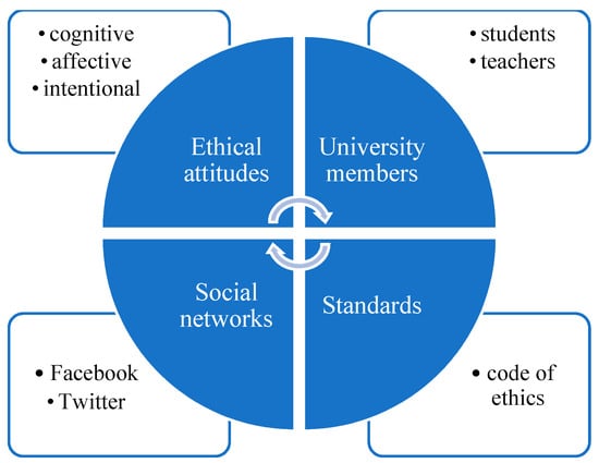 Engaging in processes of reflexivity becomes a new way to improve ethical thinking in the case of using social networks [49]. Other recent research [50] highlights the importance of cultural factors in investigating the attitudes of social network users, with reference to privacy concerns. Michaelidou et al. [51] used a mixed methods research approach to develop and validate an instrument to investigate the ethical dimensions of social media research. Moafa et al. [52] developed a model to measure the ethical effects of using social networks on students. Kia et al. [53] have proposed different ethical models of social network use in economics. In the present study, the ethical model is designed in the context of social network use in the academic environment. The concept of ethical attitudes towards social networks is at the core of the model. Following the adaptation of the definition of attitudes according to Chelcea [54], we can define ethical attitude as a global, persistent, cognitively, affectively, and intentionally motivated position of a person towards social networks, within a context of interpersonal relationships (Figure 1).