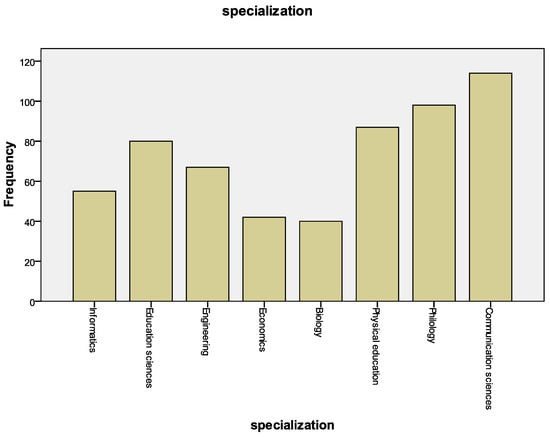 The study involved 583 (female = 433, male = 150) students at the Bachelor’s level (N = 399) and at the Master’s level (N = 180) from the following domains: Communication Sciences (N = 114), Engineering (N = 67), Philology (N = 98), Physical Education and Sport (N = 87), Informatics (N = 55), Biology (N = 40), Economics (N = 42), and Education Sciences (N = 80) from “Vasile Alecsandri” University of Bacau, Romania. The distribution of the students’ specialization is depicted in Figure 2.
