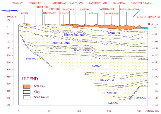 The Chao Phraya river basin is located in the central part of Thailand, where the lower plain covers an area of 22,266.49 km2 [15]. At present, the Bangkok plain is one part of the Chao Phraya river basin, where the ground elevations are above mean sea level, about 0 to 2 m Choowong [16], and cover 13,800 km2 to the Marine plain, Horpibulsuk [17]. Natalaya and Rau [18] summarized that the Bangkok plain accounts for the area from the northern part of Ayutthaya province to the southern part of the Gulf of Thailand. In the same way, the western part reaches Nakhon Pathom province, while the eastern part reaches Chachoengsao province. All borders of Bangkok plain have been the border of beaches in the past. The change in the sea water level and the sedimented soil was deposited and became clay layers alternated with sand layers [19]. Figure 1 shows the Bangkok plain and all the soil layers, starting from the upper soil layer. Next is weathered soil, and the next layers are a soil layer of soft clay, then medium stiff clay, then stiff to very stiff clay, the first sand layer, hard clay, the second sand layer, hard clay, and a third sand layer, respectively. Each clay layer is separated by a sand layer, which is called an aquifer layer. DGR [1] studied the aquifer layer of the Chao Phraya river basin, consisting of eight layers that were not connected. It begins from above with the Bangkok aquifer, then the Phrapradaeng aquifer, Nakhonluang aquifer, Nonthaburi aquifer, Samkok aquifer, Phayathai aquifer, Thonburi aquifer, and Paknam aquifer, respectively. Variations in thickness and depth are shown in Figure 2. The Bangkok aquifer is the uppermost layer, which is separated by a clay layer. The thickness of the Bangkok aquifer is about 30 to 50 m, which allows water storage but of poor quality due to contaminants. The second layer is the Phra Pradang aquifer at a depth of 100 m, which has a thickness of 20 to 50 m. This aquifer has good water quality and can be pumped at a rate of about 50 to 100 m3/hr. The third aquifer layer is the Nakhon Luang aquifer, located at 150 m, and has a thickness of 50 to 70 m. This layer has good water quality with a pumping rate of about 50 to 200 m3/hr. The fourth aquifer layer is the Nonthaburi aquifer at 200 m. The thickness of the aquifer layer is 250 m. The fifth aquifer layer is the Samkok aquifer, at a depth of 250 m. This aquifer is greater in thickness, about 100 to 150 m. The sixth layer is the Phayathai aquifer, which has a depth of 350 m and a thickness of 40 to 60 m. The seventh layer is the Thonburi aquifer, with a depth of 450 m and a thickness of 50 to 100 m. The quality of water in this layer is not good because the thin clay layer contributed to all layers. The last aquifer layer is the Pak Nam aquifer, with a depth of 450 to 550 m and a thickness of about 80 to 120 m. Overall, the observed data found that the quality of water at 550 m from the ground surface is the best groundwater for consumption.