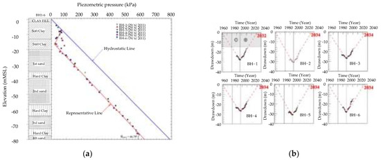 Groundwater level from monitoring well and extrapolation of the observed value. (a) Porewater pressure decrease at minimum water level. (b) Comparison of groundwater level of each borehole.