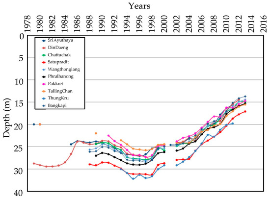 The Department of Groundwater Resources measured the land subsidence from 1978 till the present. The DGR data show the trend of groundwater level changes in Bangkok plain, Thailand. Overall, the groundwater level has a similar trend in each station. The land subsidence rate has different values related to groundwater usage in each period. The recent rate of land subsidence in Bangkok and its vicinity showed a land subsidence rate of about 2 to 5 cm/year in 2005 in the lower-half part of the Chao Phraya river basin. At the Hua Mak station, the land subsidence rate was about 9.72 cm/yr from 1978 to 1985 and 2.15 cm/yr from 1985 to 1998. After the groundwater level was controlled, the land subsidence rate rapidly decreased to 1.30 cm/yr from 1998 to 2007. Additionally, DGR data of the Pathum wan station showed that the behavior of land subsidence was stable at around −60 cm after 2007, as shown in Figure 6. In 2006, rapid land subsidence was detected due to the network pin being moved.
