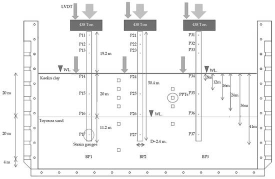 The centrifuge test was modeled based on the soil strength of the load transfer to each soil layer in the Bangkok area [25]. The stiff clay layer and medium-density sand layer are important layers because they have a high percentage of load transfer. This test focus on the consolidation behavior of clay layers. The stiff clay and medium-density sand were prepared in the model box after the water flow system was installed in the bottom of the model box. For the soil model, as shown in Figure 7, the medium-density sand layer was Toyoura sand, with a controlled density of 1.53 t/m3. Then, water was released into the model box to saturate the soil before preparing the next soil layer, stiff clay. Speswhite kaolin clay was used to represent stiff clay with a water content of 27% and density of 1.65 t/m3 by compaction after the sand layer was saturated for at least 24 h. After all soil layers were prepared, the three aluminum piles were installed via the bored pile method. Each pile had a diameter of 2.4 m (30 mm for the pile model) and a length of 50.4 m (630 mm for the pile model). The strain gauges were installed inside the aluminum pile segment by the Wheatstone bridge at seven levels along the pile to measure the load and soil strength around the pile. Additionally, the model box had other instruments to measure the soil behavior during water level changes and the pile load test, such as linearly variable differential transformers (LVDTs) to measure the soil surface deformation and pile displacement, pore water pressure transducers (PPTs) to measure the water pressure, and a load cell at the hydraulic jack to measure the load on the pile during the pile load test.