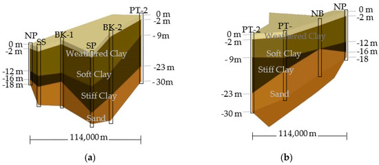 Many researchers have summarized the soil properties and soil layers by observation and investigation data in the field and laboratory, including Horpibusuk and Rachan [20], Ohtsubo et al. [21], Cox [22], and Ladd et al. [23]. All results found that the soil layer depends on many factors, such as the methodology of investigation or the limitation of testing. So, this study also summarizes soil parameters to evaluate the bearing capacity value and soil surface displacement. All soil parameters will be discussed in the next part.