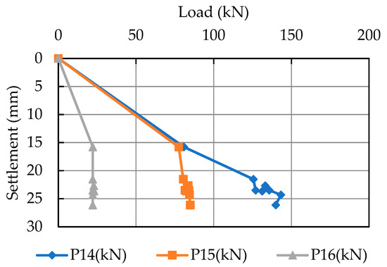 The stress distribution is the result of the centrifuge test. This part shows the relationship between the bearing capacity from the pile load test of each water level. The load was measured by strain gauges. The strain gauges were attached to the surface of the hollow aluminum pile. The labels in Figure 12, Figure 13 and Figure 14 present the results of the strain gauge. Figure 12 shows the results of the first stage of the pile load test from the centrifuge test. For the first stage, at a water level equal to the ground surface, the highest value is P14, followed by P15 and P16, respectively. The load distribution of the upper strain gauges is higher than the lower strain gauge. The result of the first pile load test has a constant load value while pile displacement still occurs at every depth. The water levels decrease to the top of the sand layer at 20 m from the ground surface. In the second stage, the load distribution result from every strain gauge gradually increased at every depth, but the magnitude was quite higher than in stage 1. Displacement in stage 2 also occurred while the load increased, as shown in Figure 13. This means the soil strength increased when the groundwater level decreased, but pile displacement still occurred continuously. In the last test, the groundwater level increased to the ground surface again. Figure 14 reveals that the total load increased, but the load of the sand layer dropped and was less than the clay layer and the previous stage, BP2.