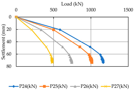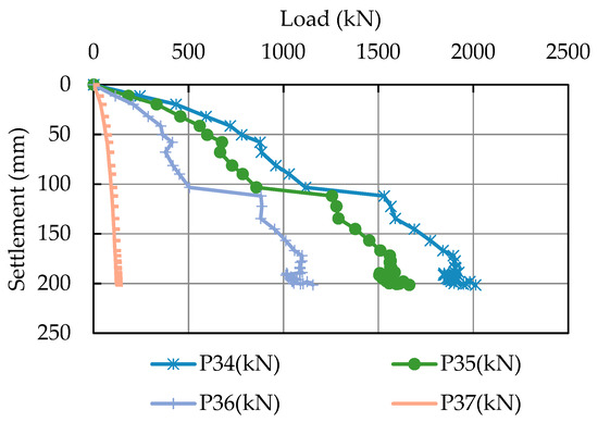 Groundwater levels in the physical model were simulated following the groundwater change behavior of Bangkok based on monitoring and prediction data [1]. So, the testing procedures were separated into three stages in one model box. The three tests depended on the elevation of the groundwater level during the load test. The bearing capacity was measured by the strain gauge during the pile load test. The names of the strain gauges are shown in Figure 7 and Table 2, for example, P11. The first digit of the instrument’s number represents the testing stages from 1 to 3. The second digit represents the location of the strain gauge. Numbers 4 and 5 of the second digit refer to the location of strain gauges in the clay layer, and numbers 6 and 7 refer to the location of strain gauges in the sand layer. This study focuses on summarizing and comparing all data from centrifuge test results, theoretical calculation, and results from previous researchers.