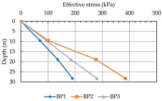 As shown in Figure 15, the effective stress increased with the increase in the depth of the soil and pore water pressure. In the case of water rising to the ground surface, the effective stress is shown as the blue line (BP1) or first stage. This shows that effective stress increased as the water level decreased. After the first pile load test was finished, the groundwater level decreased to the top of the sand layer. The effective stress increased because the porewater pressure decreased, as shown in BP2. However, following the BP3 stage, the groundwater level raised or recovered due to groundwater pumping being controlled. The effective stress decreased, but the effective stress was not equal to the first test or BP1 test.