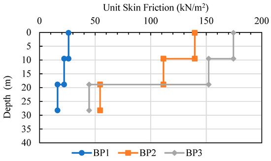 Figure 16 shows the relationship between unit skin friction and depth. BP1 had the lowest unit skin friction because the groundwater level was at the ground surface level. Then, the groundwater level decreasing to 20 m below the ground surface led to an increase in unit skin friction in both soil layers. After the groundwater level recovered to the ground surface again, the unit skin friction still increased in the clay layer but decreased in the sand layer. The unit skin friction of each test was different in the clay layer and sand layer. The unit skin friction increased in both soil layers due to the groundwater level decrease. Skin friction in the clay layer increased by about 90 to 114 kN/m2, and the sand layer increased to about 38 kN/m2. After the water level increased to the ground surface again, the unit skin friction increased in the clay layer by about 26 to 37% and decreased in the sand layer by almost 10%.