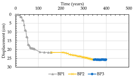 In Figure 17, the soil surface displacement results from the centrifuge test are separated into three stages depending on the groundwater levels. The first stage refers to the groundwater level as equal to the ground surface. The second stage refers to the groundwater level decreasing to 20 m below the ground surface due to groundwater pumping. The third stage refers to the groundwater level recovering to the ground surface again after groundwater pumping was controlled. The soil surface displacement results in the first stage rapidly decreased by about 21 cm. In the second stage, the displacement decreased continuously by about 2.12 cm/yr. The third stage represents the groundwater recovery period. The soil surface displacement in this stage is constant, with a rate of about 0.13 cm/yr.