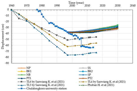 The last part refers to the situation after groundwater pumping was controlled; the soil surface displacement results from the centrifuge test were quite stable, the same as the observation data of the Chulalongkorn University station, as shown in Figure 17 and Figure 18, respectively. Following the results of soil surface displacement determined by theoretical calculation in Figure 19, there are different soil displacement rates in both methods. The values of soil surface displacement depend on the clay layer thickness, soil parameters such as water content, and the location of the bored hole. Most of the bored holes are located near the blue zone, which has a thinner clay layer than the red zone, so the soil surface displacement rate is quite low. Figure 19 shows a comparison of the soil surface displacement behavior of each method. The results consist of the centrifuge test, the theoretical calculation, the previous research of Saowiang and Giao [13] and Phoban H et al. [14], and the observation data of the DGR [1]. The study area of each result is the same, but the results are evaluated with different methodologies and calculations. So, the results from each methodology have different displacement values. The centrifuge test results and the DGR results have a similar trend, which is a very small soil surface displacement. At the same time, the results of theoretical calculation by Saowiang and Giao [13] and Phoban H et al. [14] have a similar trend in which the soil surface displacement almost constantly moves upward to the original ground surface, also called rebound displacement.
