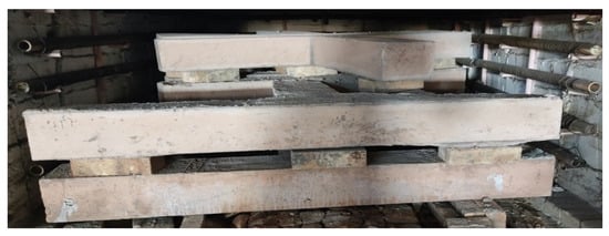 This research investigates the heat effect by subjecting three joint specimens to a temperature of 720 °C for 2 h, as shown in Figure 3. The heat curve was designed based on the ASTM-E119 [18], as shown in Figure 4. The concrete color was changed from grey to buff after subjecting the specimens to heat, as shown in Figure 3.