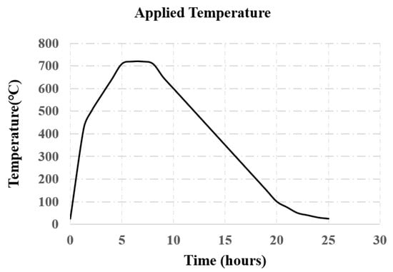 The effect of temperature was simulated in ABAQUS [22] using the experimental stress−strain curves of the heat-damaged concrete and reinforcement. The implemented stress−strain curves were extracted from the test results of the compression and splitting tensile strength tests for the heat-damaged concrete cylinders and the reinforcement bars, respectively. The material tests were performed after exposing the concrete cylinders and the reinforcement bars to a temperature of 720 °C for 2 h, according to the heat curve shown in Figure 3.