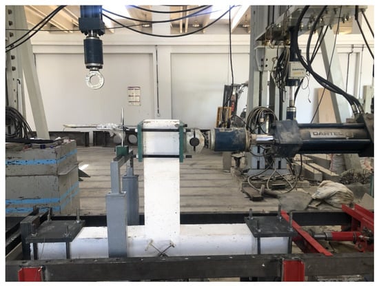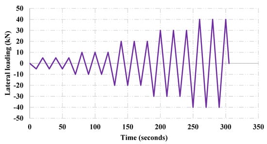 A quasi-static cyclic load was applied at the top of the beam, as shown in Figure 5 where the load rate was 0.5 kN/s. The load was applied according to the loading protocol of the ACI-374.1 [19], as shown in Figure 6. In order to study the loss of strength and stiffness in the recurring cycles of the test specimens, each loading cycle was repeated three times.
