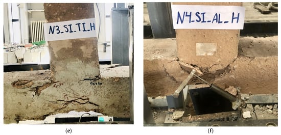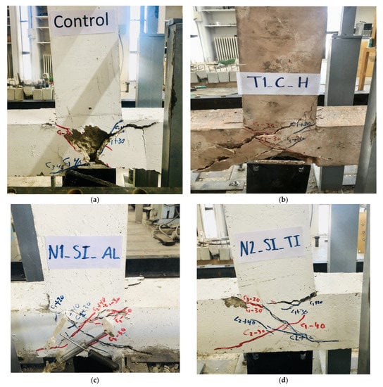 The mode of failure and crack pattern of the test specimens. (a) Control; (b) T1-C-H; (c) N1-SI-AL; (d) N2-SI-TI; (e) N3-SI-TI-H; (f) N4-SI-AL-H.
