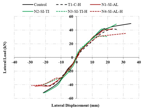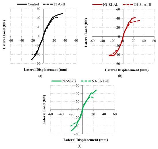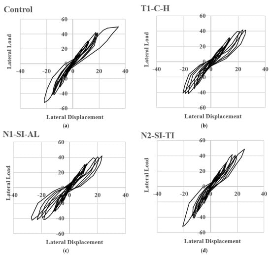Specimen N1-SI-AL was prepared from concrete modified with nano-silica and nano-alumina, where 2% of the cement weight was replaced by nano-silica and nano-alumina. The replacement of cement with 2% of nano-silica and nano-alumina increased the ductility of the specimen, where the ductility index was increased up to 30%. The enhancement in the ductility resulted in a combined type of failure of the beam hinge and joint shear failure, as depicted in Figure 7c. The load carrying capacity, maximum displacement, and drift ratio decreased by 20%, 22%, and 22%, respectively. Figure 8c illustrates the experimental hysteresis response of this specimen.