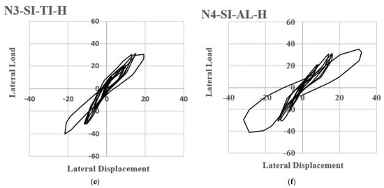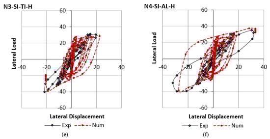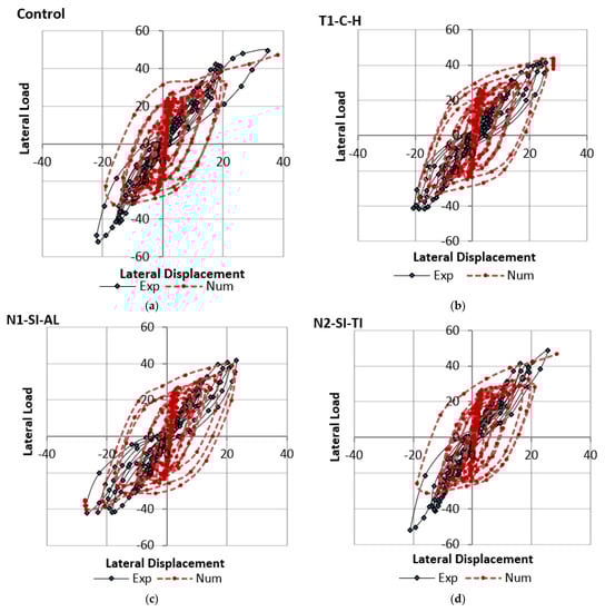 Experimental and numerical hysteresis behavior of test specimens. (a) Control; (b) T1-C-H; (c) N1-SI-AL; (d) N2-SI-TI; (e) N3-SI-TI-H; (f) N4-SI-AL-H.