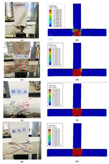 This section compares the experimental and numerical behaviors of all joint specimens. The experimental and numerical hysteresis behaviors are close, as shown in Figure 9 for all test specimens. Furthermore, the experimental and numerical crack zones are also close, as shown in Figure 10, indicating that the ABAQUS model was satisfactorily able to predict the observed behavior of the test specimen.