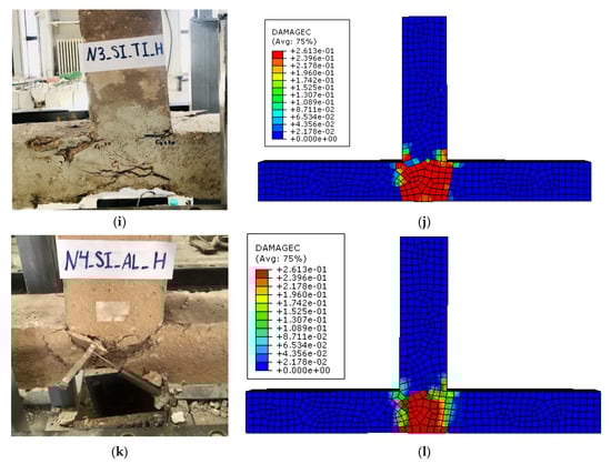 The mode of failure and crack zone of the test specimens. (a) Control—Experimental; (b) Control—Numerical; (c) T1-C-H—Experimental; (d) T1-C-H—Numerical; (e) N1-SI-AL—Experimental; (f) N1-SI-AL—Numerical; (g) N2-SI-TI—Experimental; (h) N2-SI-TI—Numerical; (i) N3-SI-TI-H—Experimental; (j) N3-SI-TI-H—Numerical; (k) N4-SI-AL-H—Experimental; (l) N4-SI-AL-H—Numerical.