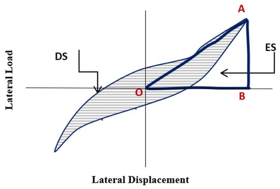 where () is the equivalent viscous damping index (), (WDS) is the dissipated energy, and (WEL) is the maximum elastic strain energy. Figure 11 demonstrates the dissipated energy (WDS) and the maximum elastic strain energy (WEL). The area of the hysteresis loop in Figure 11 defines the dissipated energy, while the area of the triangle OAB defines the dissipated energy (WDS).