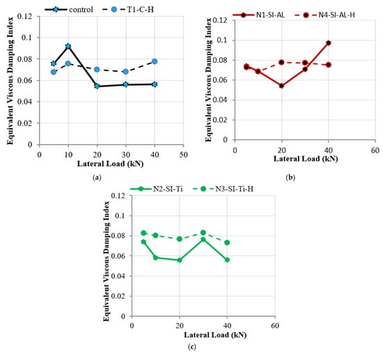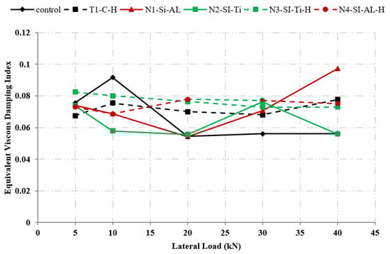 The equivalent viscous damping indices for all joint specimens are depicted in Figure 12 at the first cycle of each load increment. A comparison between the equivalent viscous damping indices for the heated and unheated joint specimens is shown in Figure 13, whereas the equivalent viscous damping indices of the control specimens are shown in Figure 13a. Figure 13b shows the equivalent viscous damping indices for specimens modified with nano-silica and nano-alumina. Figure 13c compares the equivalent viscous damping indices of the joint specimens modified with nano-silica and nano-titanium.