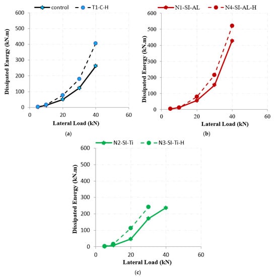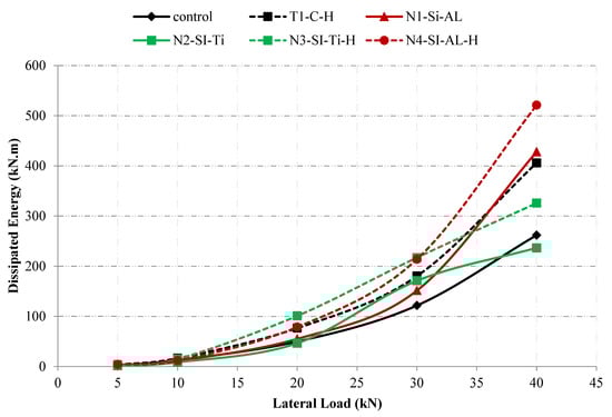 The dissipated energy for all test specimens is shown in Figure 14 at the first cycle of each load increment. Figure 14 shows that the dissipated energy of joint specimens modified with nanomaterials is greater than that measured in the unheated joint specimens stating that nanomaterials are efficient in restoring the energy dissipation capacity of the joints. The energy dissipation capacity of the RC joints modified with nano-silica and nano-alumina is greater than that measured in the RC joints modified with nano-silica and nano-titanium. Figure 15 illustrates that the dissipated energy of the heated specimens is greater than that measured in the unheated specimens because the heated specimens undergo large energy release and deformation before failure.