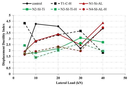 Figure 16 and Figure 17 show that the ductility index of the unheated specimen is less than that measured in the heated specimens. The displacement ductility index of the RC joints modified with nano-silica and nano-alumina is greater than that measured in the RC joints modified with nano-silica and nano-titanium.
