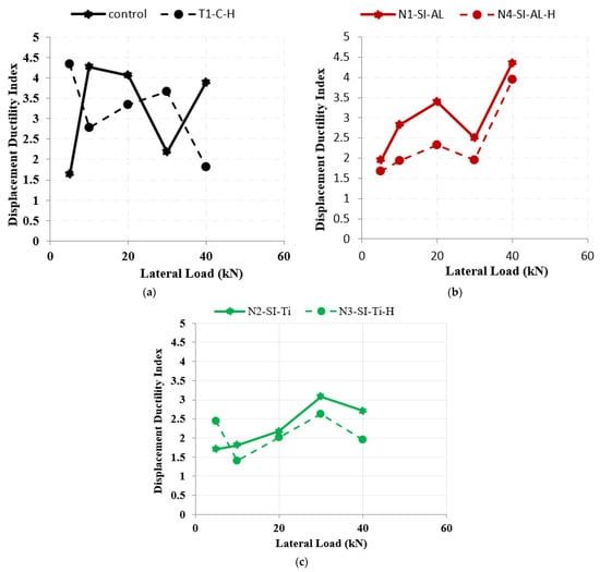 The displacement ductility index at the first cycle of each load increment for the heated and unheated specimens (a) control, (b) nano-silica and nano-alumina, (c) nano-silica and nano-titanium.