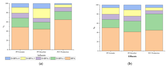 Figure 2 shows the removal efficiencies of each bisphenol at the different points studied, which did not reach 60% removal, indicating that a high number of these molecules left the different bodies of water. In the PP extruder, the removal percentages ranged between 26.64 and 34.43%, the lower value being for D-BPA-1 and the higher for D-BPA-3. In the PP desorber, the values ranged between 21.62 and 52.06% for the removal of the compounds, where the compound with the highest removal efficiency was D-BPA-1. The widest range was obtained in the percentages of the removal efficiencies, ranging from 20.34 to 59.16% and with the substance mostly removed being D-BPA-4.