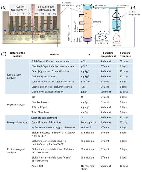 Contaminant spiking was performed in accordance with the OECD standards [50]. A concentrated mixture of DDT and BaP was solubilized in DMSO and then added to contaminate 1 kg of sediment mixed overnight at room temperature (250 rpm), which was then mixed with a further 59 kg of sediment to reach a final contamination of 35 mg·kg−1 for BaP and 28 mg·kg−1 DDT. Contaminated sediment samples were then mechanically homogenized with a 100 L concrete mixer for six hours before sub-sampling into eight separate bioreactors.