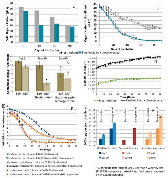 Overall depollution of the biostimulated and bioaugmented bioremediation processes, with organic carbon disappearance for the solid fraction (A) and soluble fraction (B). Disappearance of benzo(a)pyrene (BaP) and DDT (C). Evolution of the microbial biomass in the effluent for bioaugmented and biostimulated treatments (D). Acute toxicity of the effluent for the three autochthonous degrading strains used for bioaugmentation (E) and their maintenance quantified by quantitative PCR at the end of the process (F). Results presented correspond to a mean and a standard deviation of 4 reactors for each treatment.