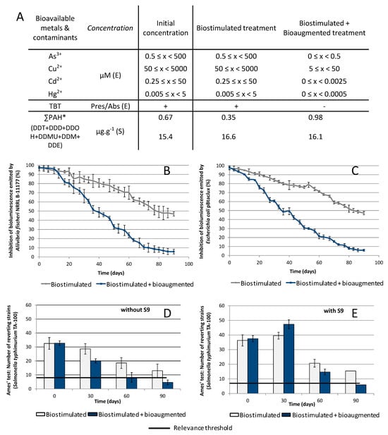 Acute toxicity of the sediments contaminated with DDT and BaP at the beginning of the experiment was significant and induced a total inhibition of the two microbial models: the marine Aliivibrio fischeri NRRL B-11177 and Escherichia coli DH1 pBTacluxCDABE (Figure 3B,C). The two treatments decreased the toxicity but, according to the two microbial models, bioaugmentation was more efficient with regard to overall toxicity reduction. At the end of the experimental period, there was a drop of 90% of toxicity in the effluent of the bioaugmented reactors compared with a drop of only 48% for the biostimulated reactors. Looking at mutagenicity (Figure 3D,E for TA100, Supplementary Data Figure S1 for S. typhimurium TA98, TA100, TA1535 and TA1537), a decrease is observed for both treatments during the 90 days of incubation. Nevertheless, whatever the time of observation, the biostimulation process never allowed a significant decrease below the threshold, while 90 days of incubation allowed the bioaugmentation process to decrease the mutagenicity with or without addition of the S9 fraction.