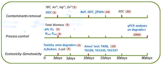 Bioaugmentation allows an overall increase in organic carbon removal and the detoxification of effluent, despite a relatively low decrease in the BaP and DDT contents. To promote these depollution approaches, it will first be essential to expand such monitoring solutions to assess the efficiency of bioremediation in field conditions. However, according to the diversity of monitoring methods that can be handled to report on a bioremediation, we investigated a relatively large panel of descriptors to characterize a bioremediation process. Among the different methods used, a restricted monitoring panel of analyses appears essential to follow change occurring over the bioremediation process, including the following: (i) organic carbon measurement reporting all biodegradation occurring in the system, as well as a specific method to monitor the decrease of the main compounds; (ii) dissolved N, P, O2 and pH measurements, ensuring the stability of the physico-chemical conditions of the bioreactors; (iii) a qPCR method to track the degraders when bioaugmentation is the selected technique; and (iv) measurements of the acute toxicity, notably toward degrading strains, and the mutagenicity are considered essential. All these analyses provide information about the steady state of the reactors (Figure 4).