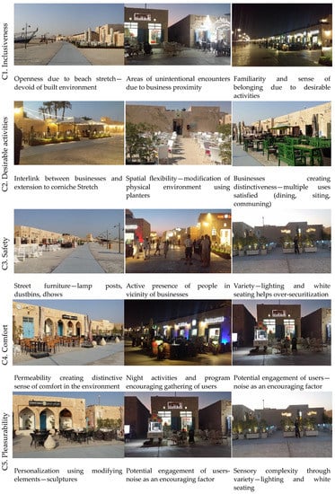 C5. Pleasurability: Imageability, high spatial quality, and sensory complexity create a pleasurable public space [51,69]. Imageability at the micro-level is measured in terms of outstanding features, articulation, variety in the architectural features of building facades, density, and variety of elements within the public space. In support of Lynch’s view, Rapoport [9] remarked that several factors coherently contribute to pleasurability, mainly the vividly identified shapes, color, and arrangement of structures. The high spatial quality of public spaces is determined by two important factors: human scale and sense of enclosure. Urban psychologists highlight that spatial quality and user interaction with physical elements lead to comfort and pleasure through convenience. Physiological and psychological pleasurability is attained through a sense of enclosure, where users distinctly experience space. Furthermore, the permeability and personalization of the space create pleasurable spaces through various environmental stimuli (such as light, sound, touches, colors, shapes, textures, etc.) [5,52,70].