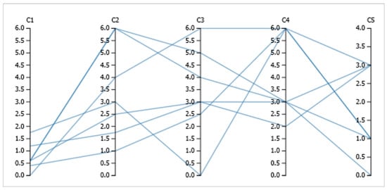 This study applied normalization and standardization to the frequency values. The normalization and standardization generated consistency among all variables. Table 2 presents the normalization and standardization matrix produced by the respective processes. Following the normalization and standardization instructions, the maximum value (xmax. = 10) and minimum value (xmin. = 2) were extracted from Table 2. Then, the subtraction of the maximum and minimum (xmax-min. = 8), the average value (=4.7619), and standard deviation (σ = 1.5897) were calculated. Next, the integrated values for each sub-criterion were calculated by multiplying the normalized value by a standardized value. Finally, the adjusted integrated value for each sub-criterion was calculated by multiplying the integrated values by the frequency values. According to Table 2, the criteria C2, C3, and C4 equally received the highest adjusted integrated values (Xint.-adj. = 1.429). Among all sub-criteria, Sc.3.5 (elements discouraging spatial use) received the highest adjusted integrated value (Xint.-adj.Sc.3.5 = 2.614). After Sc.3.5, the sub-criteria Sc.2.4, Sc.2.6, Sc.2.7, Sc.3.4, Sc.3.7, and Sc.4.4 received the highest adjusted integrated values (Xint.-adj.Sc.3.5 = 1.603). In contrast, Sc.1.7 (diversity of activities and behaviors) received the lowest adjusted integrated value (Xint.-adj. = 0.081).