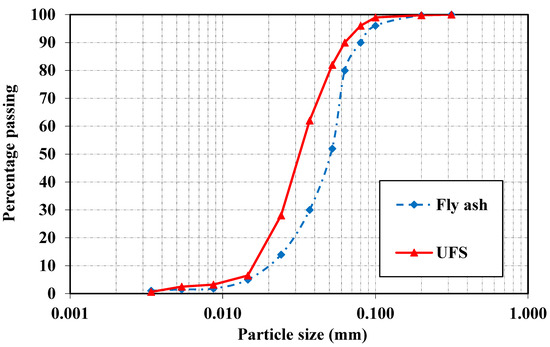 Figure 1 presents the particle size distribution (PSD) curve of fly ash and UFS, while Figure 2 shows the PSD curve of NA and RCA. Table 3 shows the properties of NA and RCA. It can be seen from Table 3 that the water absorption of RCA was higher (4.25, 4.25, 4.15% for nominal sizes of 7, 10, and 14 mm) in comparison with the water absorption of NA (1.11, 1.12 and 1.18% for the corresponding nominal sizes). Fly ash and UFS were also examined using X-ray diffraction (XRD) to study their microstructure, and the results are depicted in Figure 3. The XRD study shows the presence of high quartz peaks, mullite, calcite, in fly ash, while the UFS indicates an amorphous structure along with calcite compounds. UFS addition results in the formation of improved calcium silicate hydrate (CSH) gel, which fills the voids and leads to a denser structure [32].