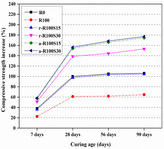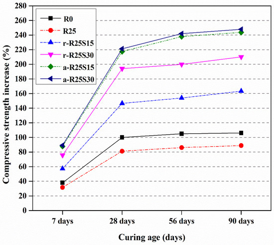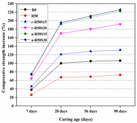 The compressive strength increase (%) is defined as the ratio of compressive strength of the concrete with varying % of UFS and RCA content to the 28 days compressive strength of the control mix, R0. The compressive strength increases with respect to curing ages are displayed in Figure 4, Figure 5 and Figure 6. It can be seen from Figure 4, Figure 5 and Figure 6 that the compressive strength of the GPC significantly increased with increasing UFS content and curing ages. The addition of UFS in the production of GPC filled the pores, as also observed in the previous study [16]. In the study by Parveen et al. [16], UFS was used as an admixture to enhance the properties of fly-ash-based GPC and it helped in filling voids and creating a compact matrix. UFS improved the microstructure by improving interfacial bonding between the paste and the RCA. Furthermore, in Series II, the UFS was added on top of fly ash, which led to denser microstructure. Thus, Series II showed better performance in terms of compressive strength when compared to Series I.