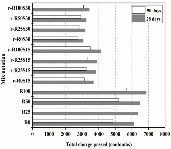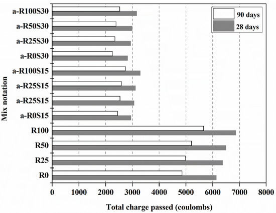 To measure the chloride penetration resistance of the GPC mixes, an RCPT test was carried out, and the results of the RCPT test for Series I and Series II are shown in Figure 9 and Figure 10, respectively. At 28 days, the charges passed in Coulombs for the reference mixes R0, R25, R50, and R100 were observed to be 6132, 6370, 6490, and 6860 Coulombs. This decreased at the age of 90 days, found to be 4856, 4980, 5210 and 5663 Coulombs. Addition of UFS was expected to enhance the microstructure of the GPC with RCA; therefore, RCPT of mixes with UFS in both the series were less than that of the reference mixes. For example, RCPT of mixes r-R0S15, r-R25S15, r-R50S15, and r-R100S15 were found to be 3679, 3822, 3894, and 4116 Coulombs, respectively, while mixes a-R0S30, a-R25S30, a-R50S30 and a-R100S30 showed 2821, 2930, 2985, and 3156 Coulombs, respectively.