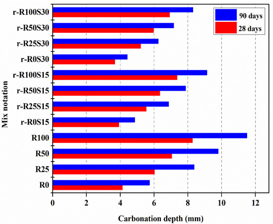 - Similar to water absorption, the carbonation depth increased with the increase in RCA content. However, reduced depths were observed for both series of GPC with UFS.