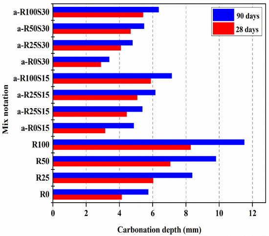 Figure 11 and Figure 12 show the carbonation depth of different GPC mixes of Series I and Series II, respectively. The carbonation depths for the mixes R0, R25, R50, and R100 were 4.1, 6.0, 7.0, and 8.2 mm at 28 days, indicating an increase in carbonation depth with an increase in RCA content. On the other hand, the carbonation depth decreased with the increase in UFS content, which was expected based on the observation from water absorption and chloride penetration. For Series I, the carbonation depths at 28 days were found to be 3.9, 5.5, 6.3, and 7.3 mm for the mixes r-R0S15, r-R25S15, r-R50S15, and r-R100S15, respectively, while for the mixes r-R0S30, r-R25S30, r-R50S30, and r-R100S30, the carbonation depths were observed to be 3.6, 5.2, 5.9, and 6.9 mm, respectively. This decreasing trend of carbonation depth was more pronounced in Series II since its total UFS content of similar mixes was nearly twice that of Series I. The minimum carbonation depth was achieved by mixes a-R0S30, a-R25S30, a-R50S30 and a-R100S30, and the corresponding values were 2.8, 4.0, 4.6, and 5.4 mm, respectively.